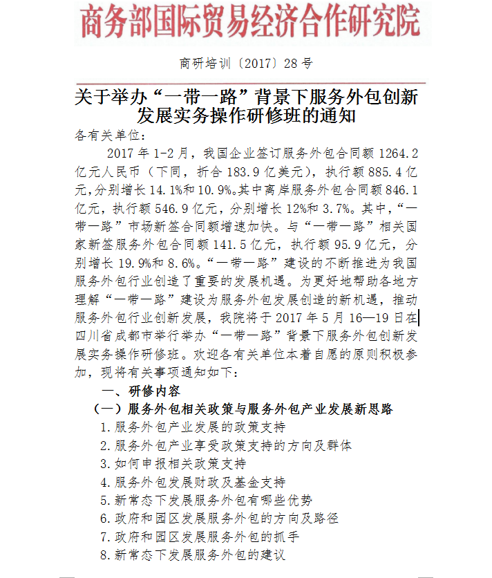 關(guān)于舉辦“一帶一路”背景下服務(wù)外包創(chuàng)新發(fā)展實(shí)務(wù)操作研修班的通知