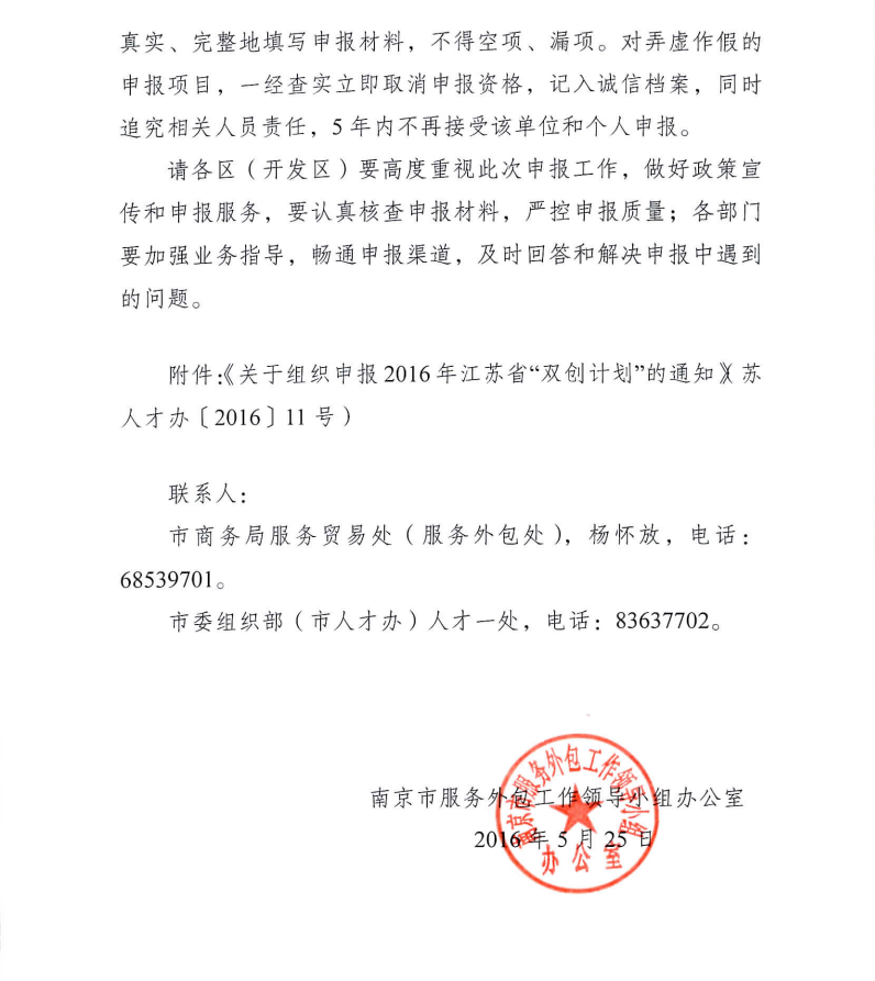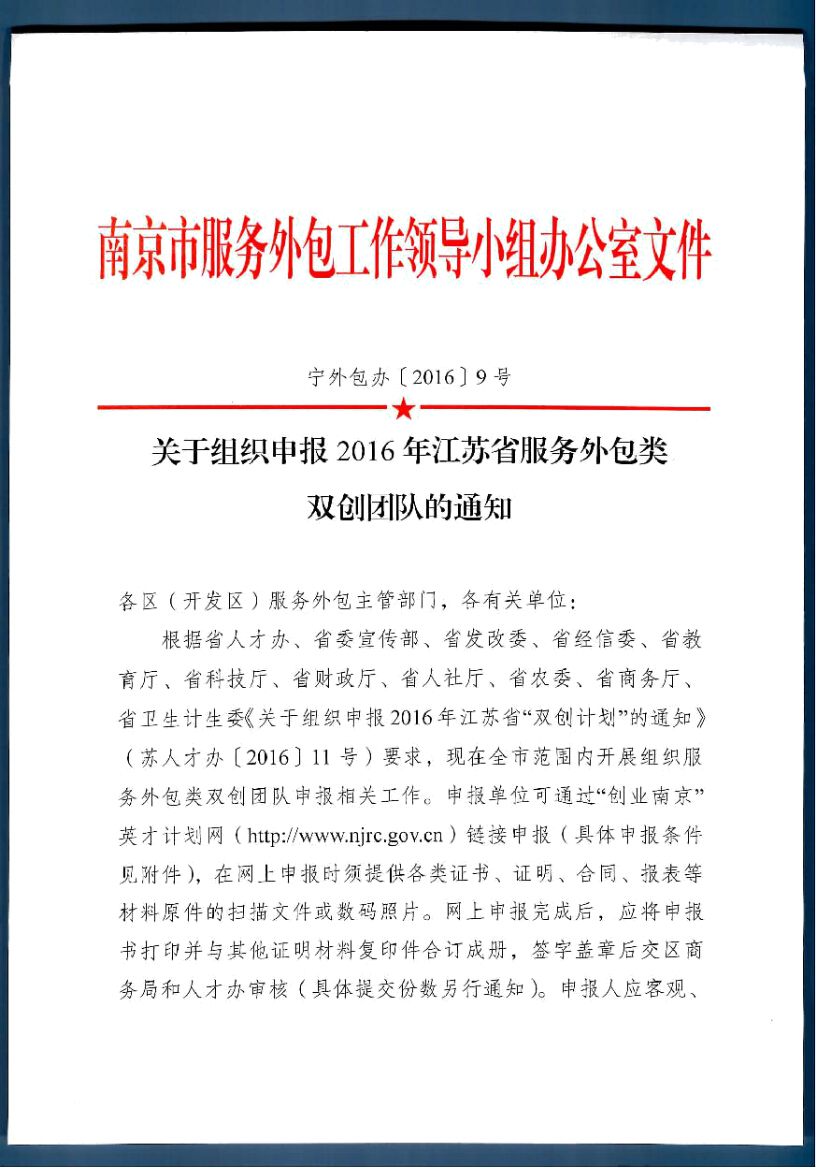 關于組織申報2016年江蘇省服務外包類雙創(chuàng)團隊的通知
